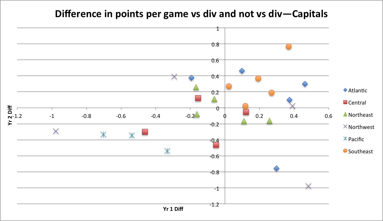 (It's probably also worth noting that after coaching changes, we expect an adjustment period, and the Caps have had two of those in the last two years. The adjustment periods came largely before the run into the playoffs, when most of the non-divisional games happen.)